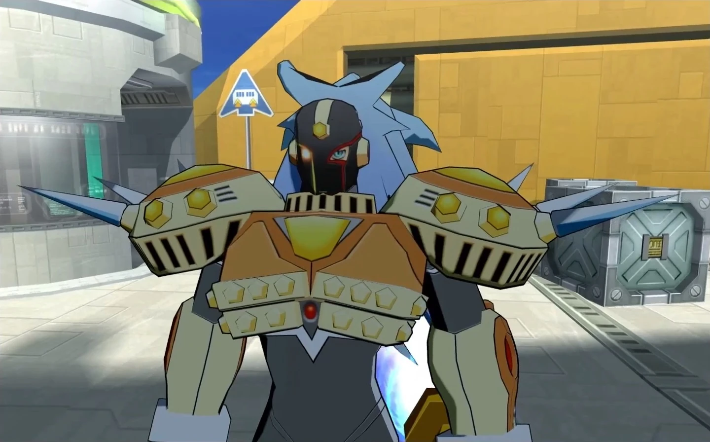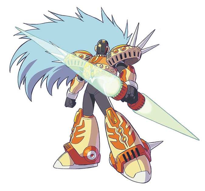 Scarface is a tall Reploid with yellow armor. His legs and shoulders have an orange wing design, and his shoulders are wide with spikes on them. His entire head is covered in a form-fitting black helmet, and his right eye appears purely white as though it was once damaged. He has a head of long, silver-blue hair that flows behind himself. In battle he wields a double-bladed beam lance.