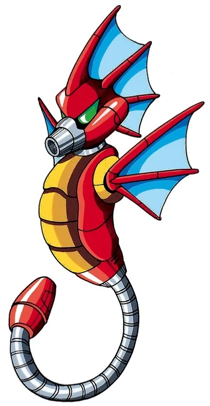 Sea Attacker (シーアタッカー) is a seahorse Mechaniloid that was originally designed as a novelty for human homes.[1] It appears in Launch Octopus's stage in Mega Man X and Mega Man Xtreme 2. They shoot up from below (bubbles indicate that they'll appear) and after being stationary for a moment, they roll up and speed toward X. From Mega Man Maverick Hunter X they also appear in the first Sigma Palace stage right before X faces Launch Octopus. They aren't very strong, causing little damage and going down with few hits. They come in packs of three, and they usually launch themselves out of spike pits, though they can surprisingly rise from regular terrain.