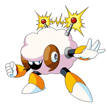 Sheep Man only has two attacks normally. His first attack is the Thunder Wool, in which he will jump high into the air and split into four clouds of wool, which will each move to a different location. Then each wool will fire a thunderbolt to the ground that shocks a small area, and the last cloud will launch an electric spark along the floor, and then turn back into Sheep Man. This indicates that the last cloud to move/attack is him; if Mega Man shoots it, Sheep Man will take damage and fall, canceling the rest of the attack. His other attack is a fairly fast orb of electricity that bobs up and down.
