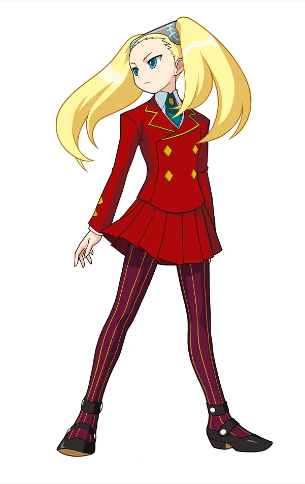 Sherrice is a young girl with blonde hair, twintails hair and blue eyes. She wear a red jacket, a white undershirt, a red skirt, dark purple tights with yellow lining and black footwear. Adorning her head and holding up her twin tails is a head accessory resembling an ancient artifact[2].