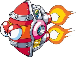 Shield Guard, known as Shield Attacker in Japan, is a version from Mega Man Powered Up that has a propeller instead of a jet engine, making them slower. Their shields can be knocked out by some attacks. They appear in Time Man's stage and Ice Man's stage.