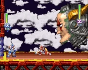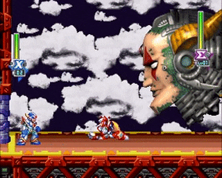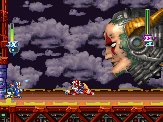 In this giant head form, Sigma attacks with projectiles from his eyes and mouth, teleporting to the right side of the arena after each move. He can only be damaged when he opens his mouth to expose the cannon barrel within. After losing half of his energy, he fires a large purple energy beam from his mouth.