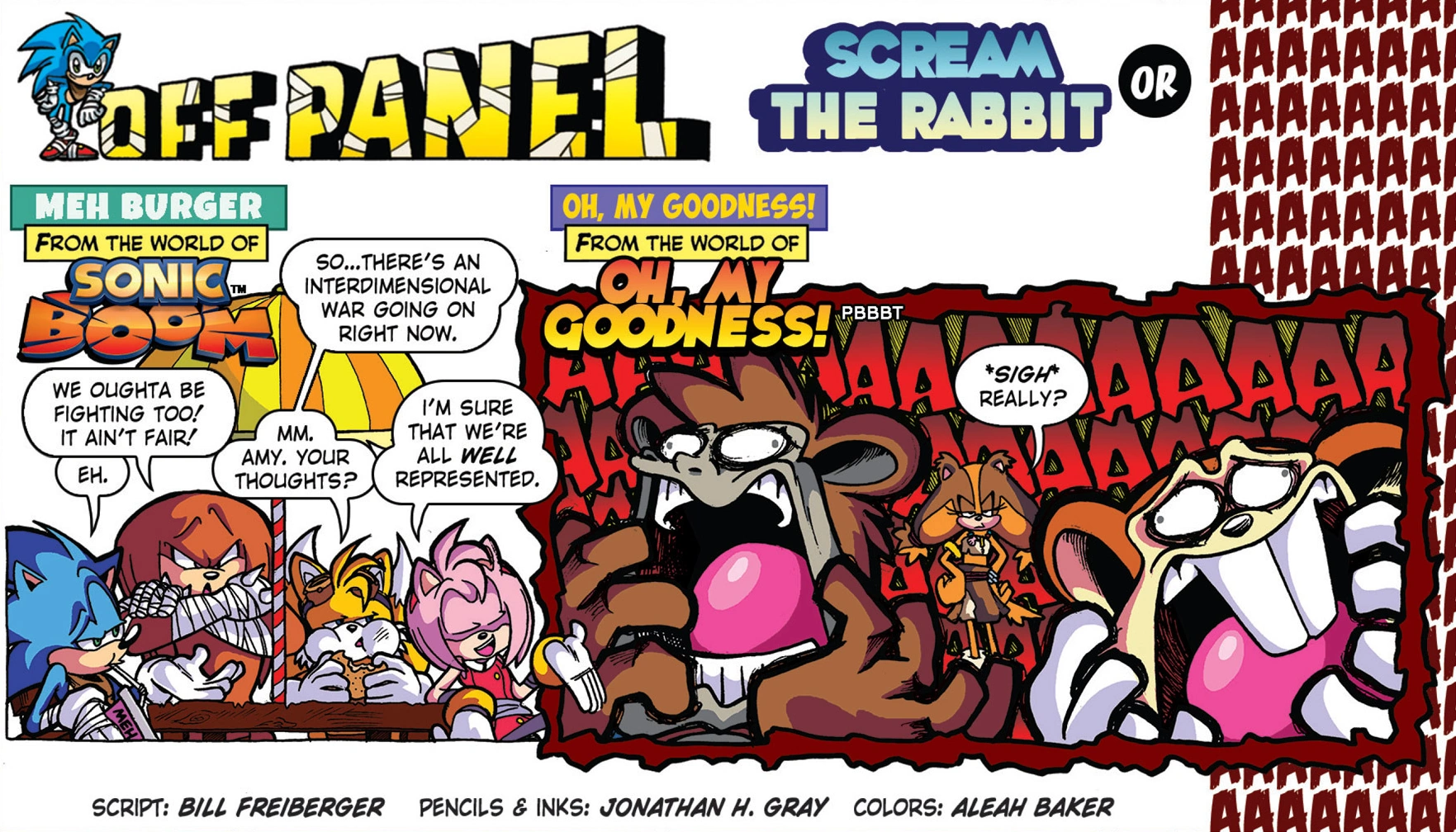 In the Sonic Boom world, Sonic and his friends wonder about the crossover and if they are well represented. Elsewhere, Fastidious Beaver and Comedy Chimp are screaming in panic.