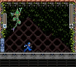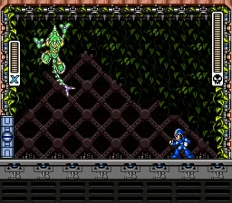 Sting Chameleon spends most of the battle hanging from the wall or ceiling, and can blend into his surroundings to near invisibility. He tries to catch the player off-guard with his stealth and misdirection, attacking from many different angles. This can make him difficult to target, but his movements can become predictable via observation. He is weak to Boomerang Cutter, which instantly pries him off the wall and can be used to lock him into a pattern.