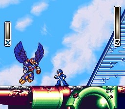 Being an air Reploid, Storm Eagle has advantage in aerial combat, swooping down on his enemies with his beak and bird bombs. Several of his attacks cause no damage and merely push the player backwards; the real danger is the arena, as it is surrounded by fatal drops. With the Foot Parts, X can dash to avoid being blown over the edge. Storm Eagle is weak to bladed attacks, taking increased damage from Chameleon Sting in Mega Man X, Spin Wheel in Mega Man Xtreme, or Sonic Slicer in Mega Man Xtreme 2.
