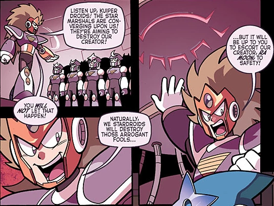 In the manga Mega Man Gigamix, the Stardroids are powerful space robots that attack Earth, destroying several robots in the process.[1] To power Dark Moon, he challenges and defeats Mega Man in combat, providing Dark Moon with despair from the people. Eventually, a repaired and upgraded Mega Man is able to destroy him, but his own despair and hatred provides the energy to bring forth Sunstar.