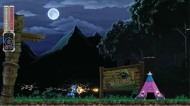 Mega Man starts outside the camp. After passing by several robots and some tepee, Mega Man enters a burning area where a lethal flame wall appears behind him and slowly advances forward, forcing Mega Man to rush forward to escape from it. Speed Gear can help Mega Man move faster, and Tundra Storm can temporarily stop the wall's advance. Afterwards Mega Man will pass by a pitch black area that is iluminated by Lampers before reaching the mid-boss, Sparkey.