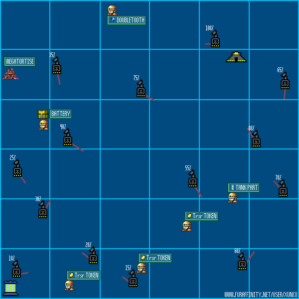 Upon your first visit to this island, you are instructed to follow the cables coming out of the transmitters scattered about the area. You can wander freely in a large square area that on your HUD map is a 6x6 grid (and beyond, but invisible walls restrict you to this space), where the ongoing sandstorm greatly reduces visibility. There are various kinds of broken Mets that hold items, and one deployable Mega Tortoise that requires a battery, one of which can be found in the nearby Metool wreckage (though you may want to consider also the other batteries - one earlier in the Ulfat Factory, the other later in the Melda Ore Refinery - and the other mechaniloids they go to; one where you fought Silver Horn, the other in Gimila Mine, which blocks a path: the Mega Tortoise is the least hassle to access later).