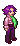 Viddy Narcy has purple hair, pink eyelids, red lips and a gray earing on their right ear. They wear a pink shirt, dark purple pants, a green scarf and black shoes.