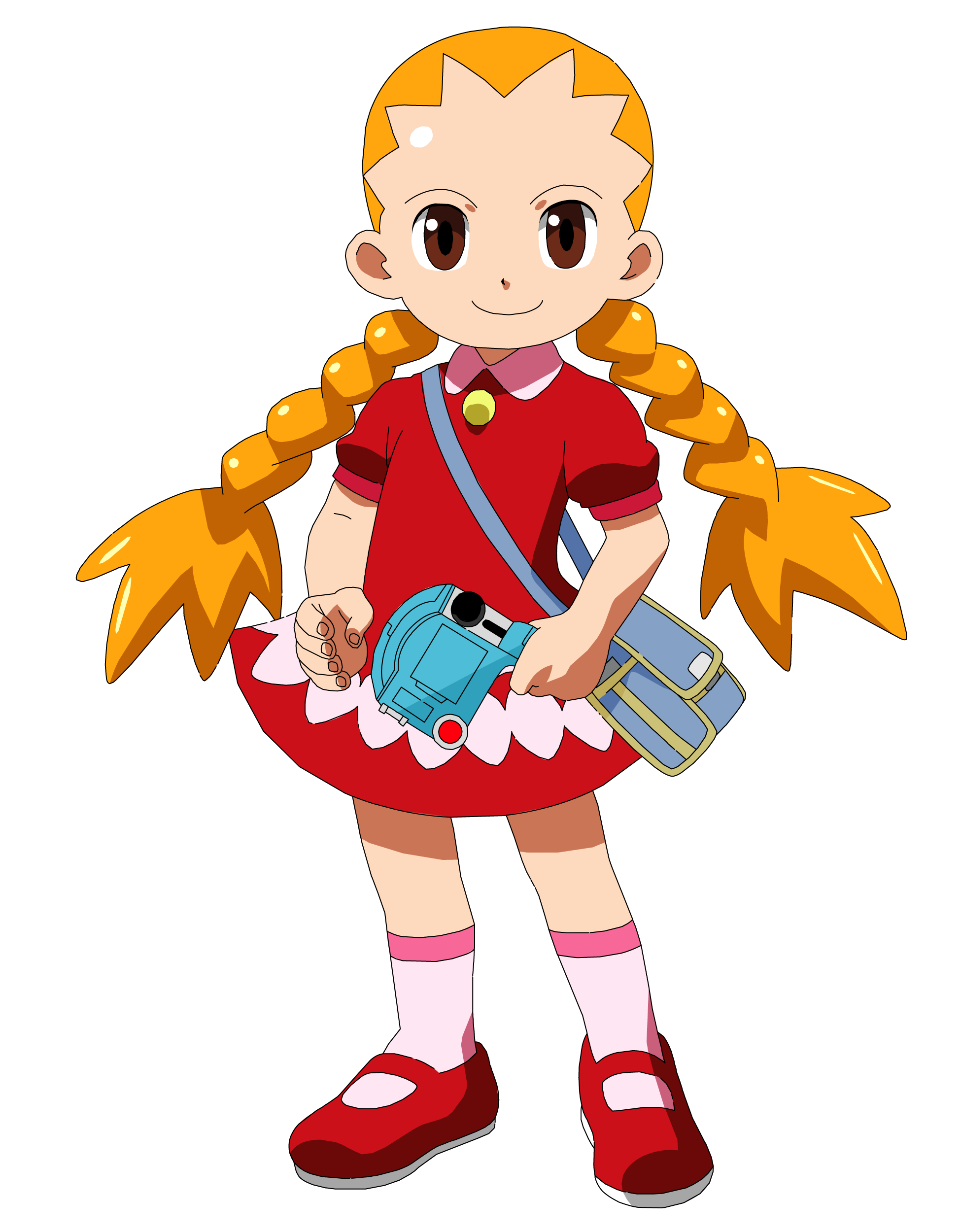 Yai has blonde hair tied with two long braided ponytails and brown eyes. She wears a red dress with pink highlights and a gold button on top, she also wears pink socks with red highlights and red Mary Jane shoes.